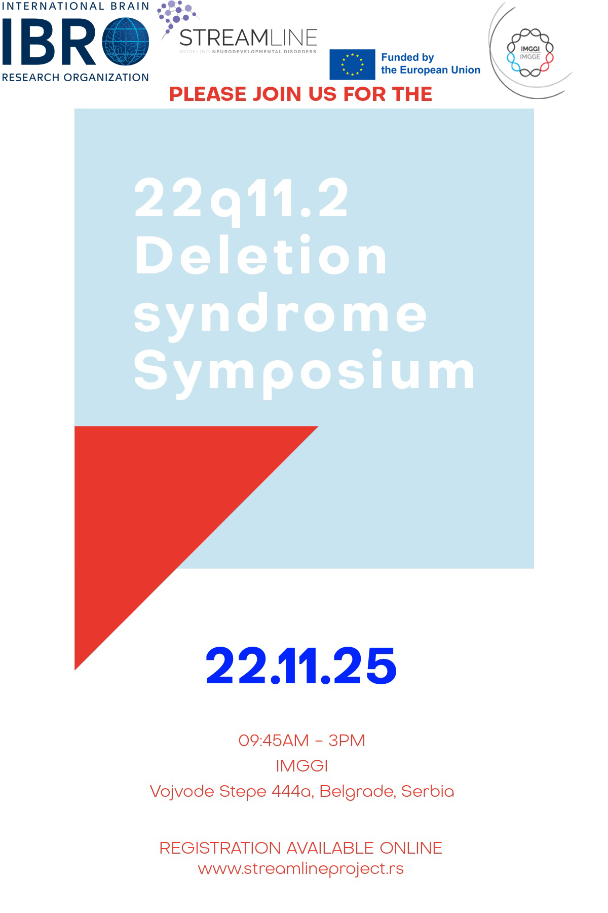 У суботу, 22. новембра 2025. године са почетком у 9:45 у ИМГГИ ће бити одржан Симпозијум о синдрому делеције 22q11.2 који је повезан са високим ризиком за развој неуроразвојних поремећаја. Циљ Симпозијума је да се окупе родитељи и деца са синдромом делеције 22q11.2 и дискутују о најновијим сазнањима са експертима из ове области. У симпозијуму ће учествовати предавачи из Србије, као и стручњаци из Европе и Америке са дугогодишњим искуством у истраживању и дијагностици синдрома делеције 22q11.2.